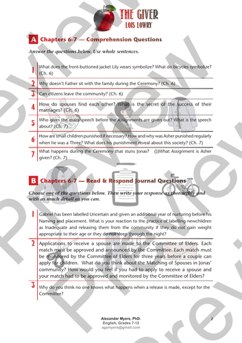 The Giver Lois Lowry Chapters 6 7 Symbolism Activities Answers Teaching Resources